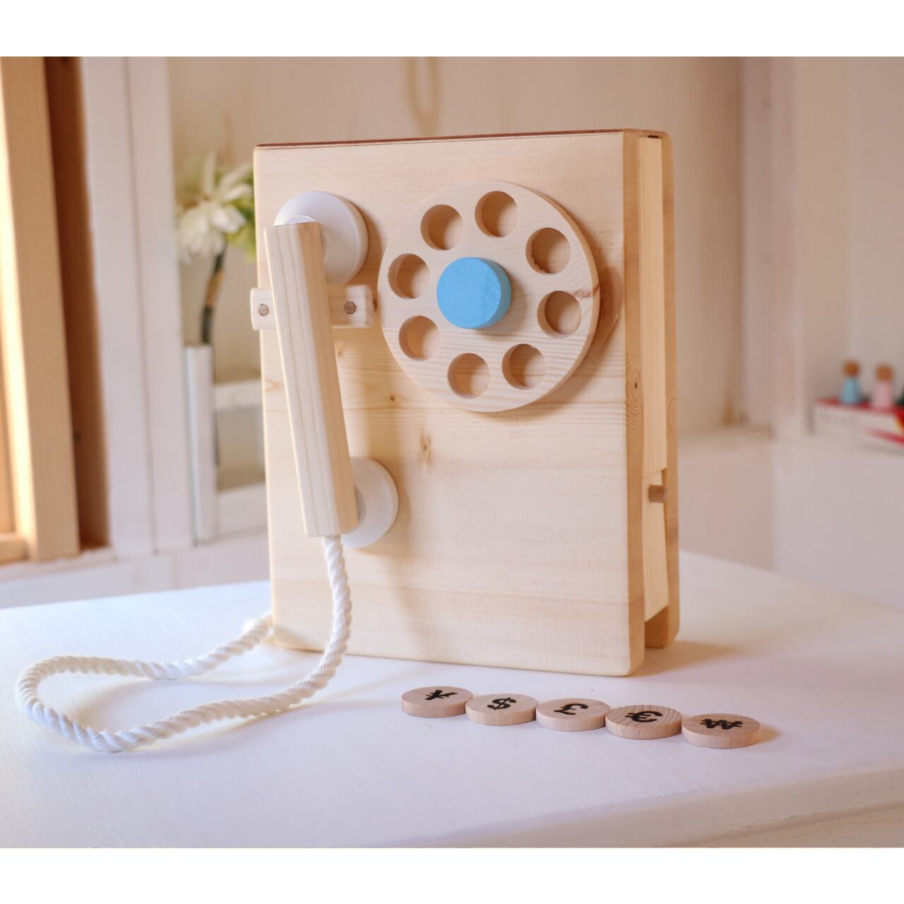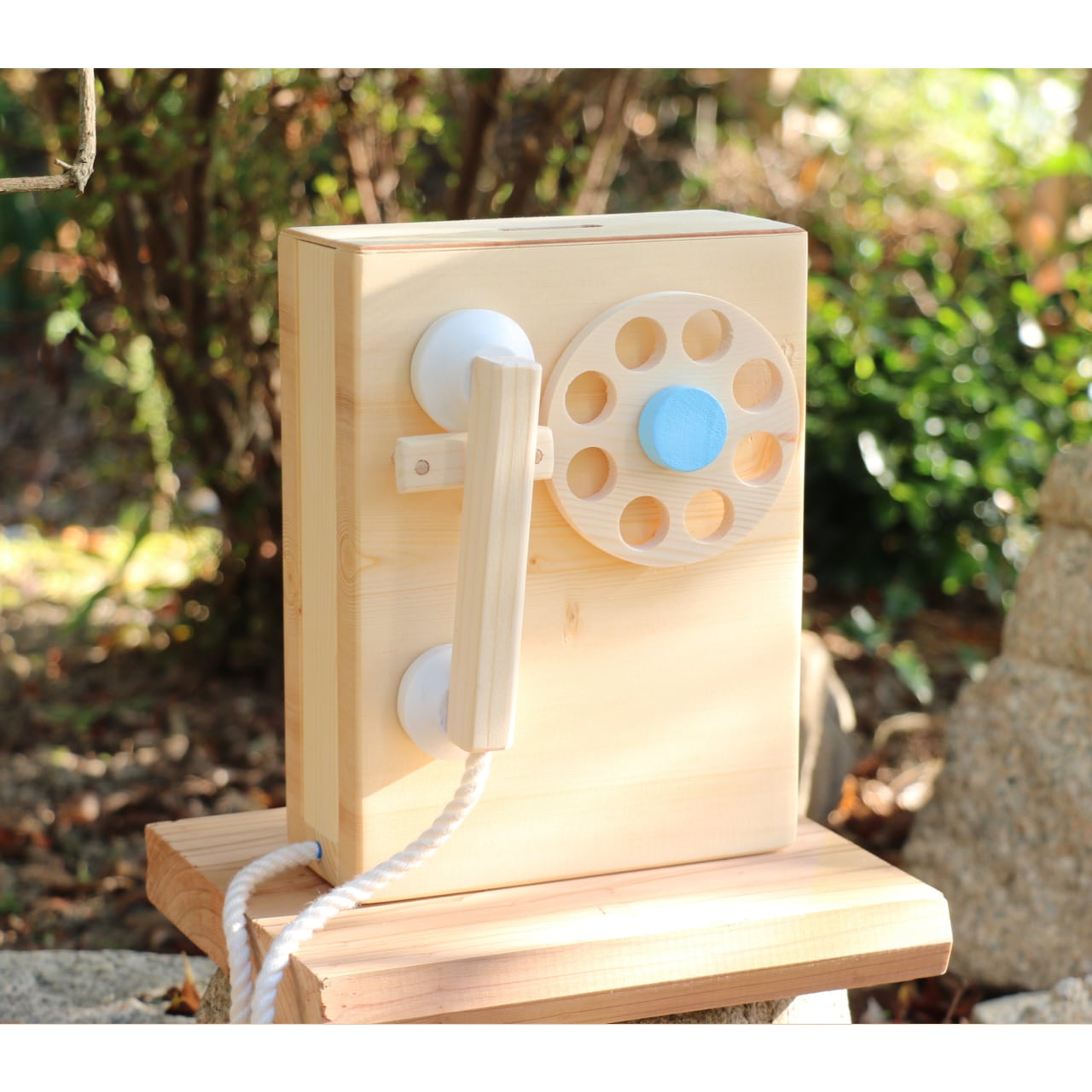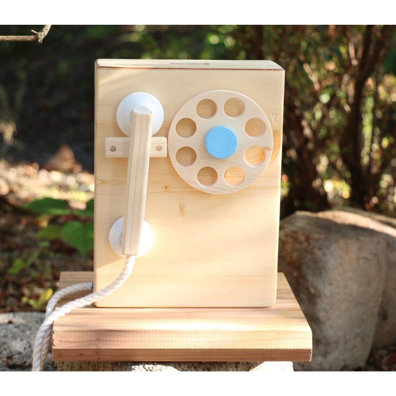 木のダイヤル式固定電話 (水色)